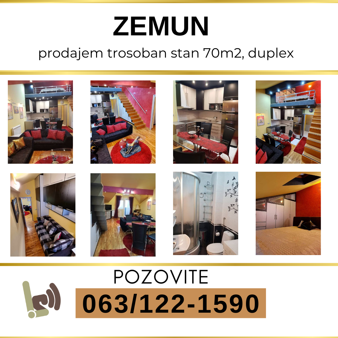 Zemun, na prodaju stan 70m2, duplex, trosoban, namešten, dve terase, 5 ugradnih plakara, Dogovor, za sve inforamcije pozvati vlasnika Kontakt 0631221590